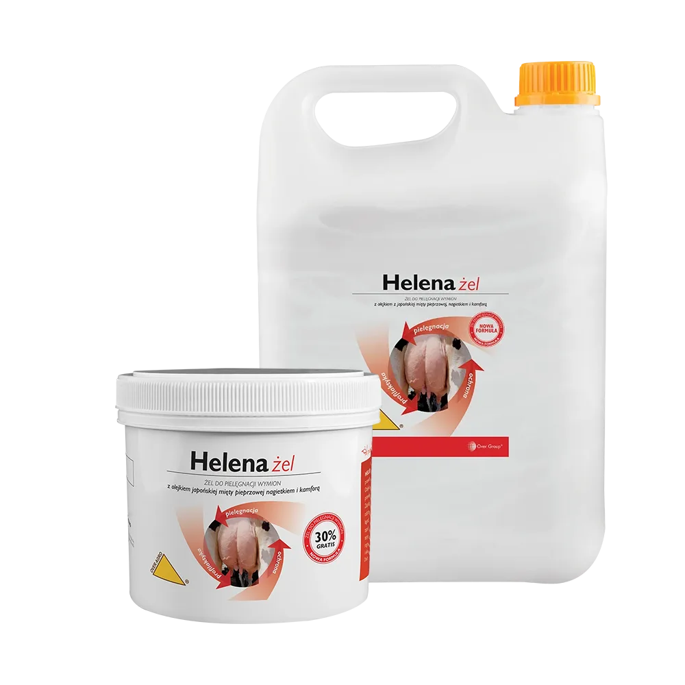 Helena żel to profesjonalny preparat pielęgnacyjny przeznaczony do wzmocnienia i poprawy zdrowia skóry wymion u krów mlecznych. Produkt oparty jest na aktywnych, naturalnych składnikach takich jak mięta pieprzowa, mentol, nagietek, kamfora oraz olejki eukaliptusowy i lawendowy – składniki te wspierają poprawę ukrwienia skóry i łagodzenie stanów zapalnych.
